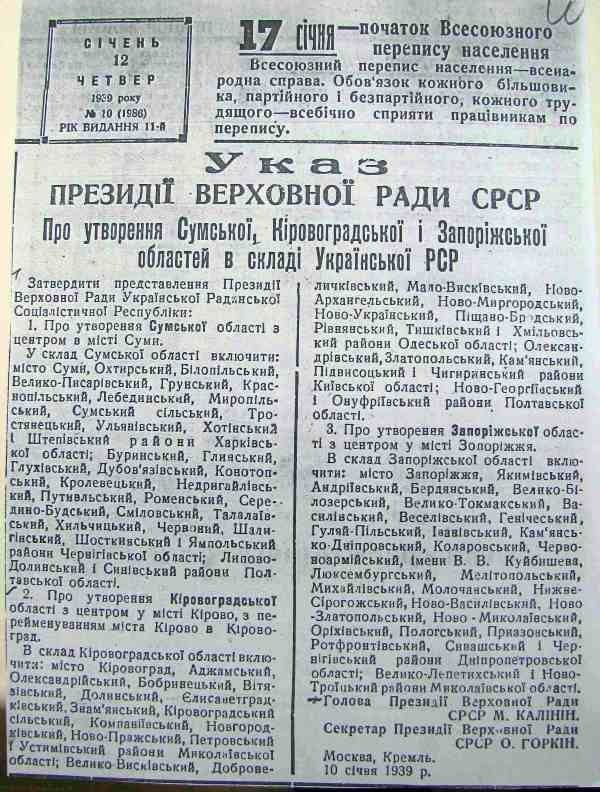 10 січня 1939 року згідно з Указом Президії Верховної Ради СРСР було утворено Сумську область із центром у м. Суми.