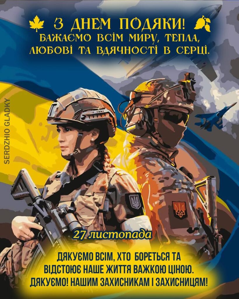 А ще, хочемо подякувати нашим захисникам та захисницям, які віддають за нас життя, тому ми не маємо жаліти слів, щоб сказати їм: “Дякую”. Але інколи буває так, що хочеться сказати багато, але у вирі емоцій не можеш підібрати жодного слова. Дякуємо Вам, наші Герої, за твою сумлінну службу і надійний захист. Ви — наша гордість і опора родини. Завдяки Вам ми живемо і мріємо про краще майбутнє разом!